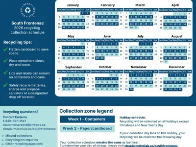 As of July 1, 2025, all recycling in the Township is now being managed by Circular Materials and picked up by their Contractor Emterra Environmental. The new recycling program includes changes to the recycling collection schedule and the materials collected. If you missed your new recycling day, unsure of the material mix, or for more information about Producer Responsibility, visit circularmaterials.ca/southfrontenac. Recycling is no longer managed by the Township – please direct all questions to Emterra Environmental: 1-888-597-1541 or customercareont@emterra.ca